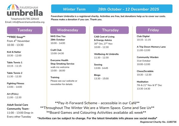 For our current programme of Winter Term sessions, which starts on Tuesday 28th October, please see below. If you would like to find out more, or book a place on any activity, please email info@favershamumbrella.org or call 01795 229143 during opening hours (10:00 – 15:00, Tuesday to Friday).